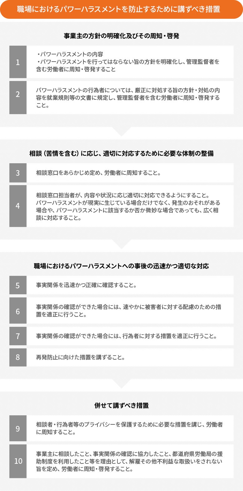 事業主が、その雇用する労働者又は事業主(法人である場合はその役員)自身が行う職場におけるパワーハラスメントを防止するため雇用管理上講ずべき措置は以下のとおりです。