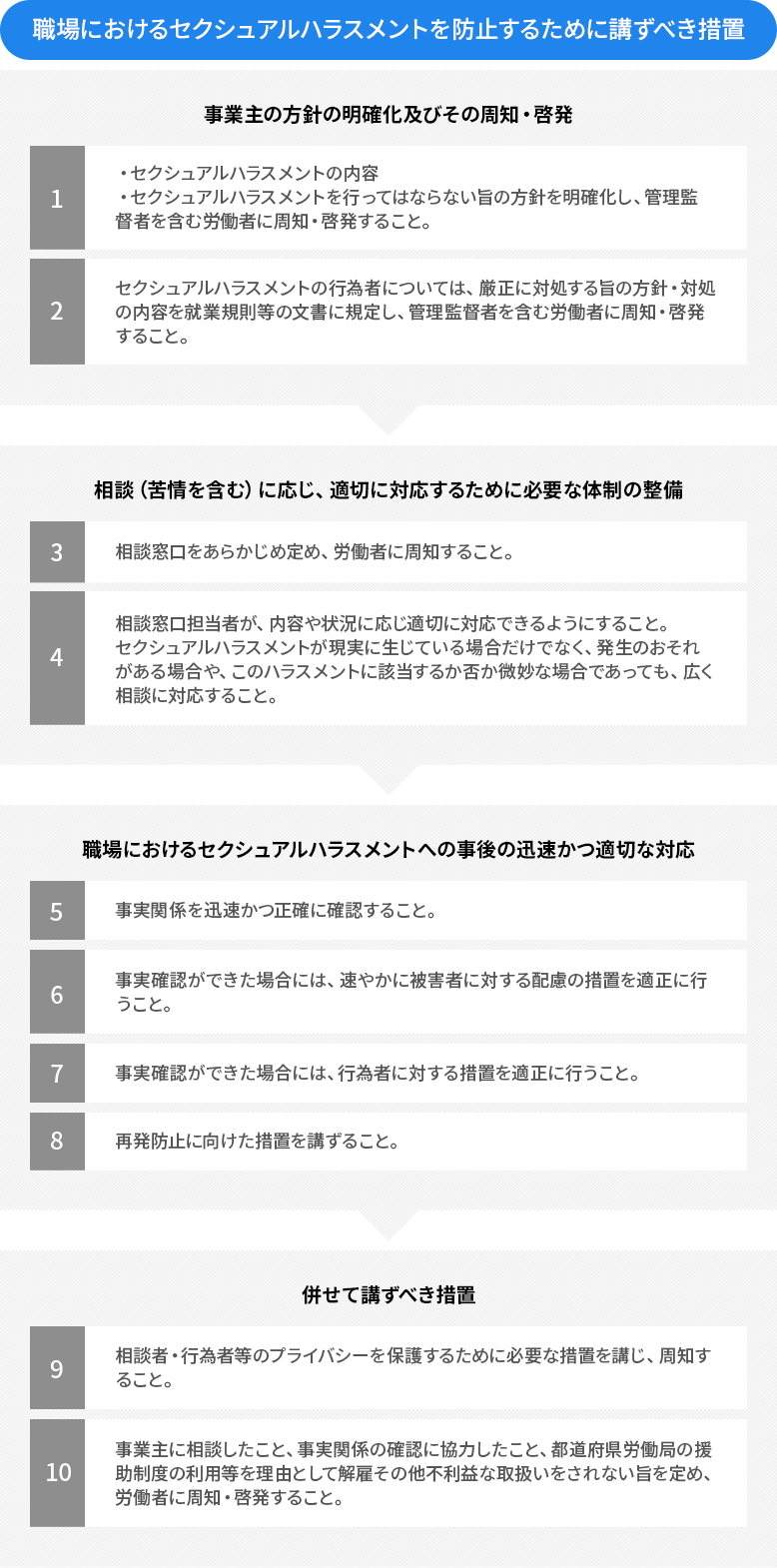 事業主が、職場におけるセクシュアルハラスメントを防止するため雇用管理上講ずべき措置は以下のとおりです。