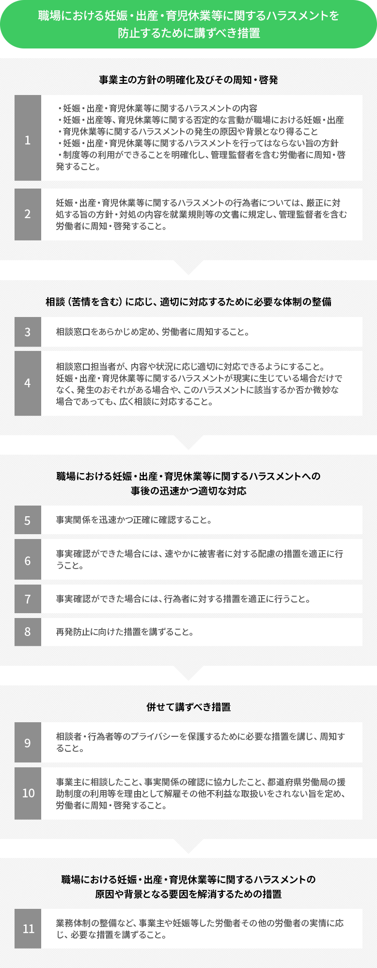 事業主が、職場における妊娠・出産・育児休業等に関するハラスメントを防止するため雇用管理上講ずべき措置は以下のとおりです。