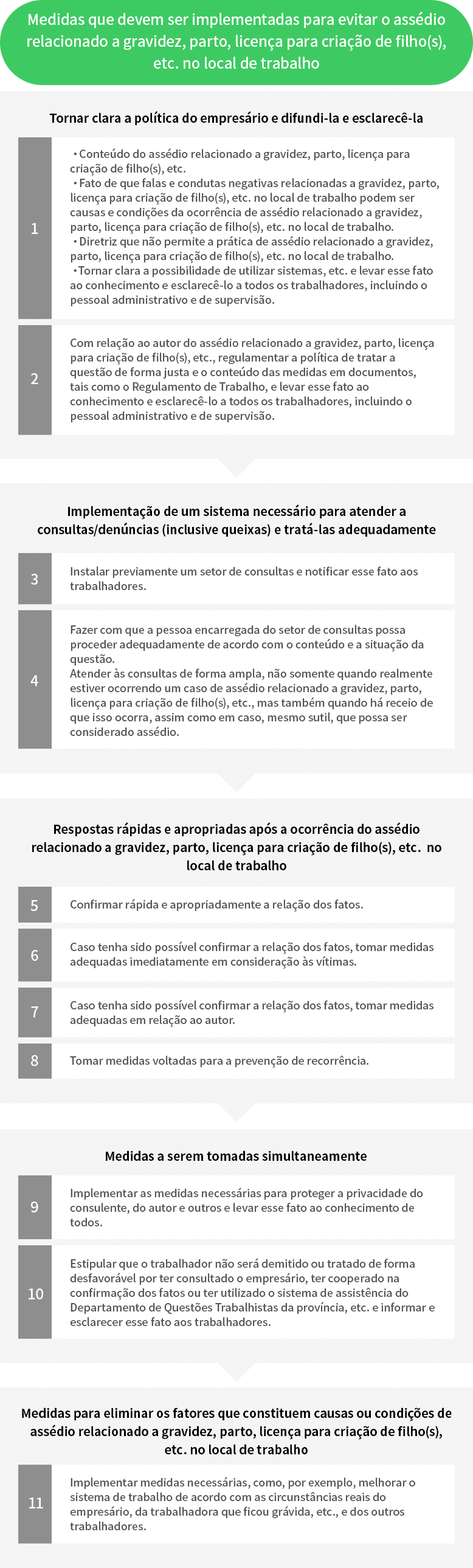 O parágrafo 3 do Artigo 11 da Lei de Igualdade de Oportunidades de Emprego para Homens e Mulheres e o Artigo 25 da Lei de Licença para Criação de Filhos e para Cuidados a Pessoas com Necessidade de Assistência obrigam o empresário a implementar medidas preventivas contra o assédio relacionado a gravidez, parto, licença para criação de filho(s), etc. no local de trabalho.